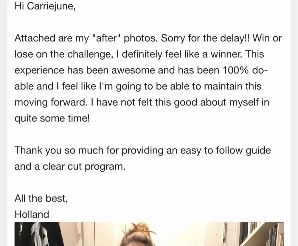 Set yourself up for success with a comprehensive nutrition and training program that has been proven on hundreds of thousands of Carriejune’s clients. Stay on track with a like-minded, supportive, fun group of people and have Carriejune as your coach, helping and encouraging you every step of the way! Take Control Over Your Health!