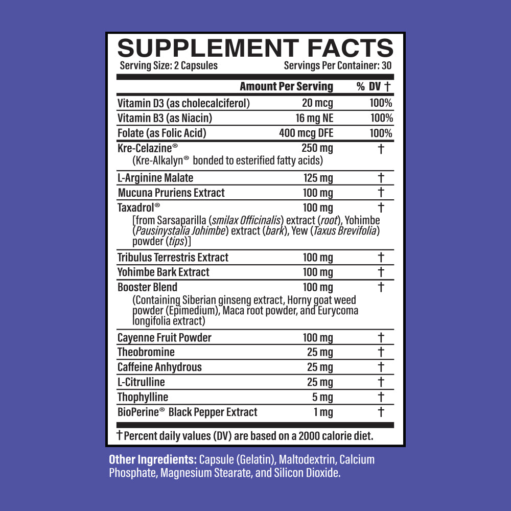 • Booster Blend (100 mg): Synergistic mix of Ginseng, Maca, Horny Goat Weed, and Tongkat Ali for total-body drive.