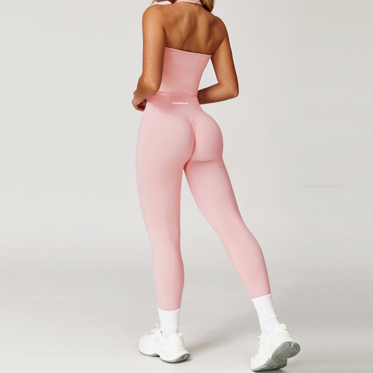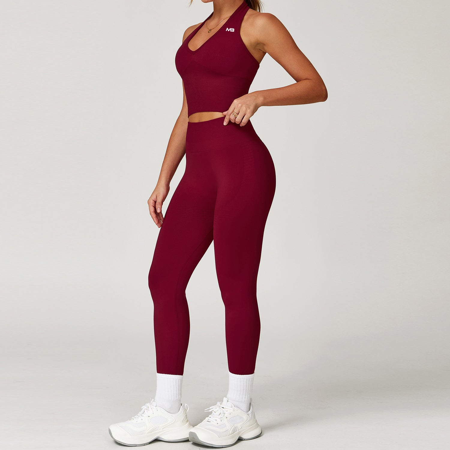 The Empress Halter offers a flattering neckline with a smooth, body sculpting fit. The fabric feels silky and light while still giving support through the bust and waist. It pairs perfectly with the leggings and shorts for a full matching set or works beautifully on its own with any bottom.